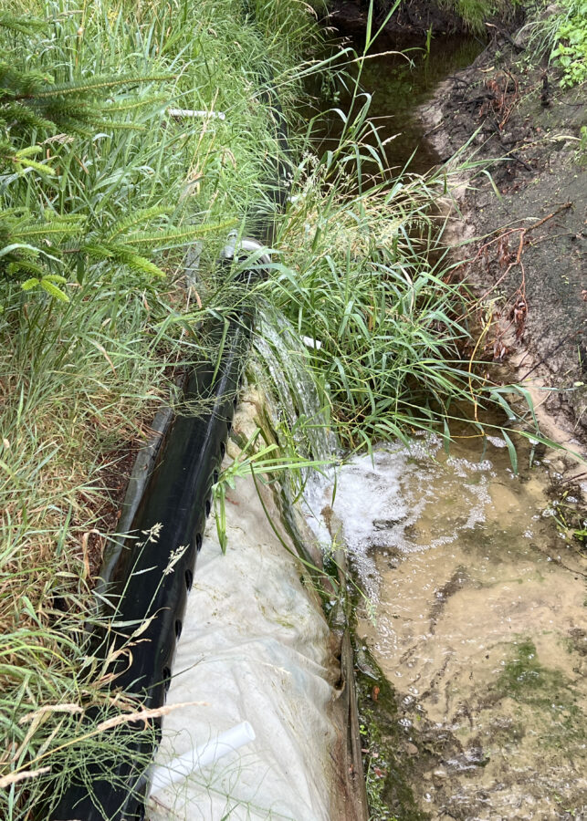 • Installation von Drainagesträngen: Insgesamt wurden 1.400 Meter Drainage in den Boden eingefräst, aufgeteilt in etwa 31 Stränge à 45 Meter. Diese sind in sechs Teilabschnitte unterteilt, die schrittweise in Betrieb genommen werden.