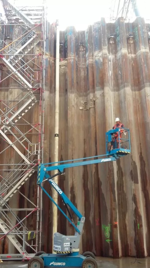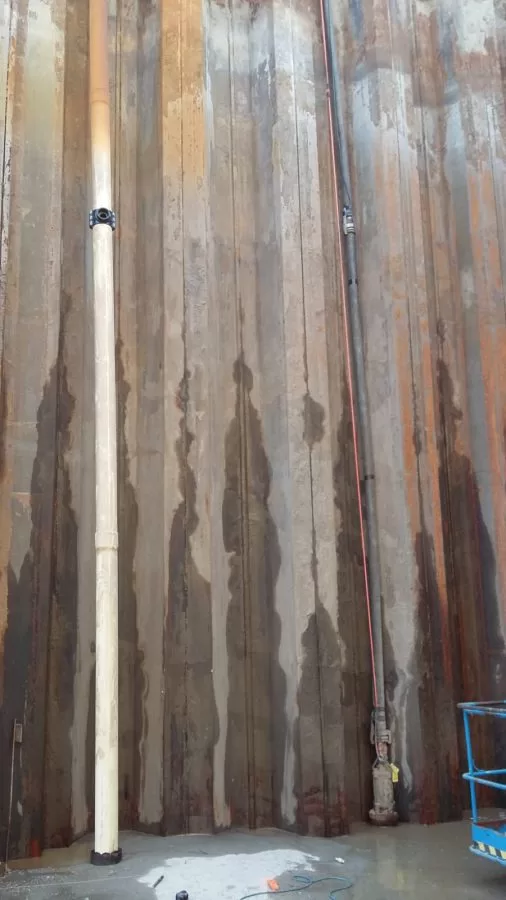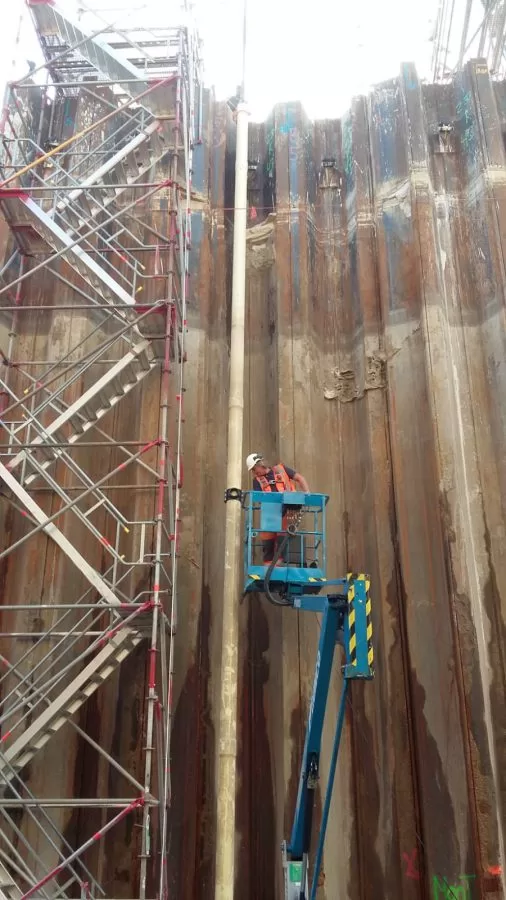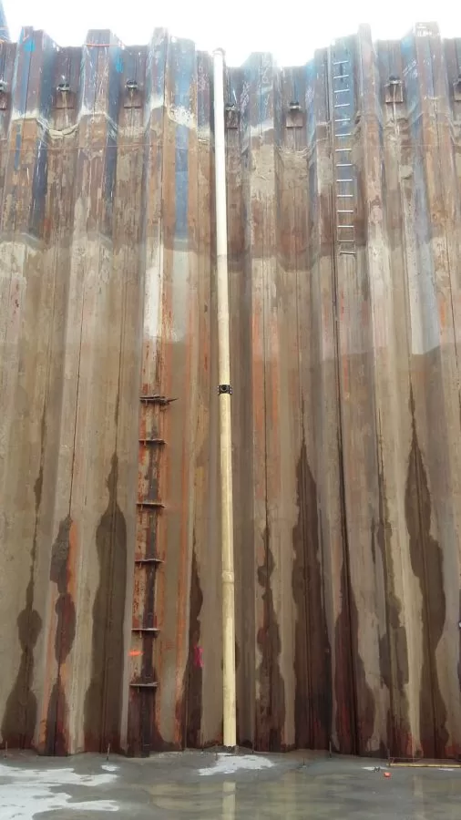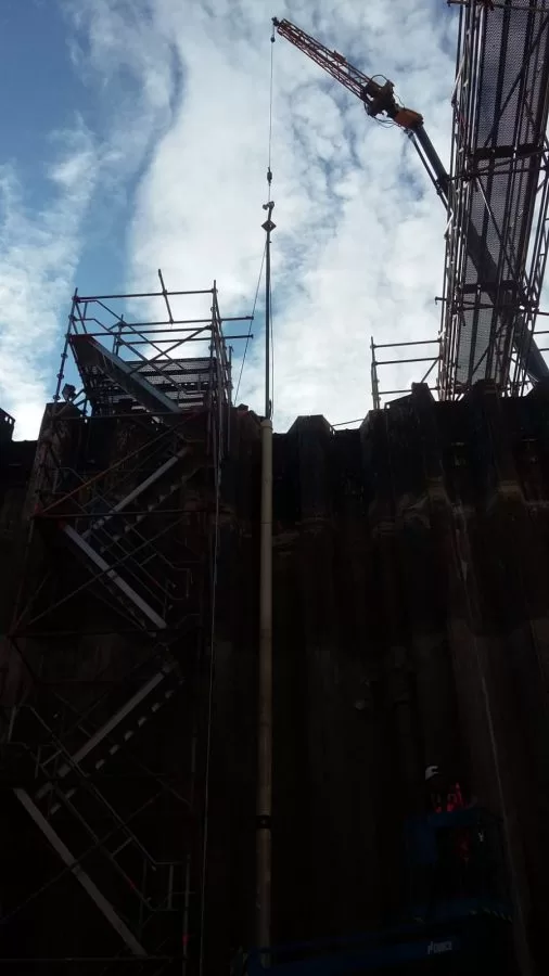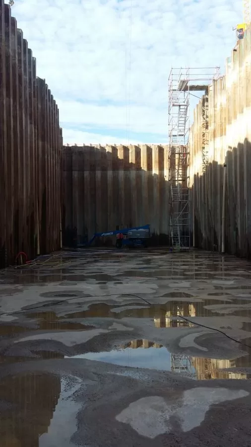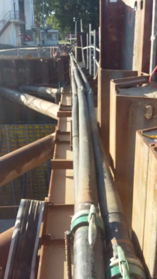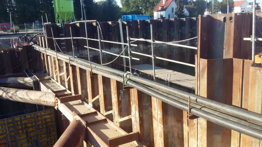 Das Restwasser, das durch die Spundwand dringt, wird mit Glockenpumpen abgepumpt. Das Entwässerungssystem hat eine sichere und trockene Arbeitssituation auf dem Boden der Schleusenkammer (ca. 14 m tief) geschaffen.